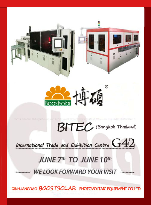 2017年6月7日-6月10日,由知名主办方UBM Asia举办的第十二届泰国国际可再生能源展,在曼谷国际贸易展览中心举行。此展会为大家提供了较好的国际贸易交流与合作的平台。专业致力于光伏设备制造14年之久的企业----博硕光电,携公司新进研发的全自动汇流条焊接机、高速双轨BSSW-3600串焊机等自动生产线设备